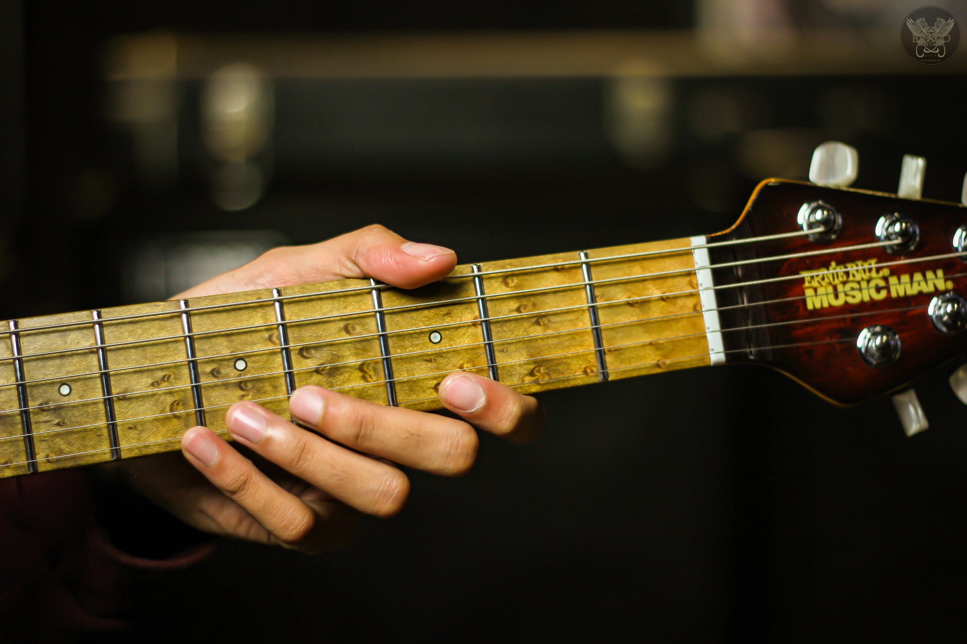 Standard Music Man strings-thru-the-body bridge of chrome plated, hardened steel with bent steel saddles.