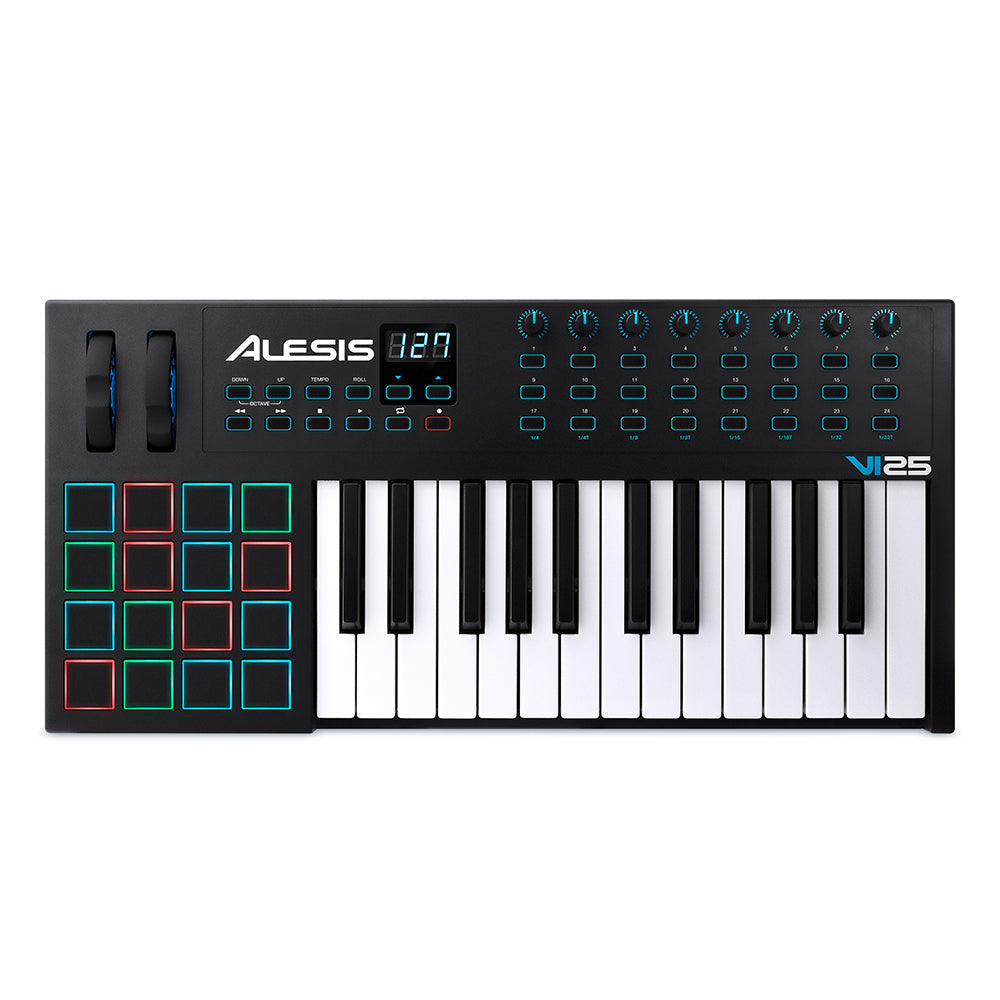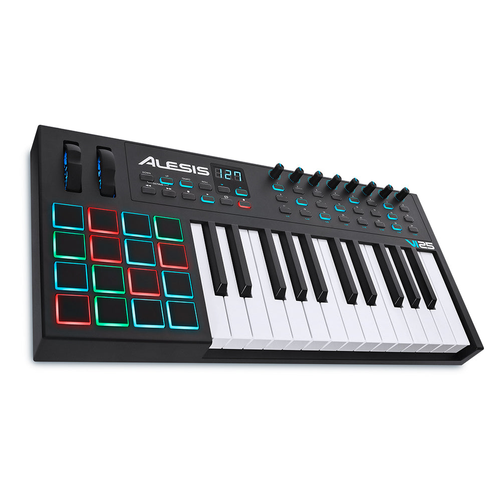 The Alesis VI25 is an advanced USB/MIDI keyboard MIDI controller that lets you take command of your music software with a series of pads, knobs, and buttons. With 25 velocity-sensitive semi-weighted keys with aftertouch and Octave Up/Down buttons, you can expand the keyboard to the full melodic range and play bass lines, chords, and melodies. VI25 also features 8 assignable knobs and 24 assignable buttons for manipulating effect plugins and virtual instruments: open and close filters, adjust volume levels, activate effects, tweak parameters, and more. 16 velocity-sensitive RGB trigger pads allow you to launch clips or finger drum with exceptional response and colorful visual feedback. Plus, pitch and modulation wheels expand the expressive capabilities of your performing.