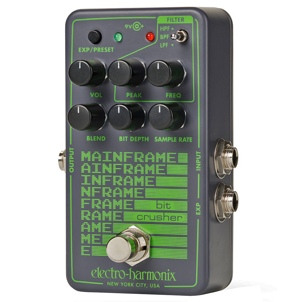 The Mainframe’s selectable High/Low/Band-Pass filter lets the user shape the artifacts of the bit crushing and sample rate. Another very cool feature is its Sample Rate Tuning Mode where the pedal analyzes your input signal in real-time and sets the sample rate to match the pitch of your signal, or a set interval above your signal. This allows you to set the sample rate to match the key of a song, or it will continually adjust the sample rate based on what you play!”