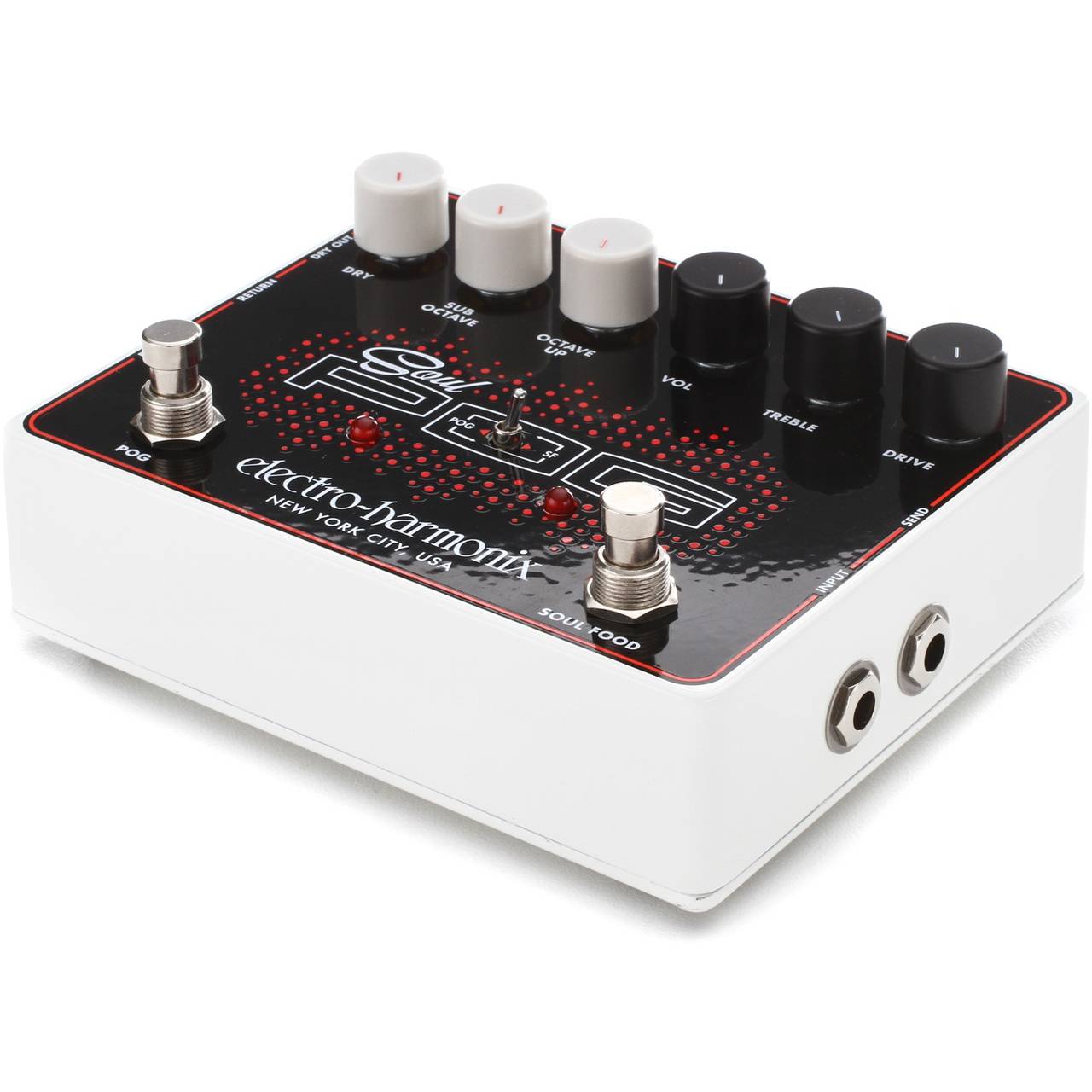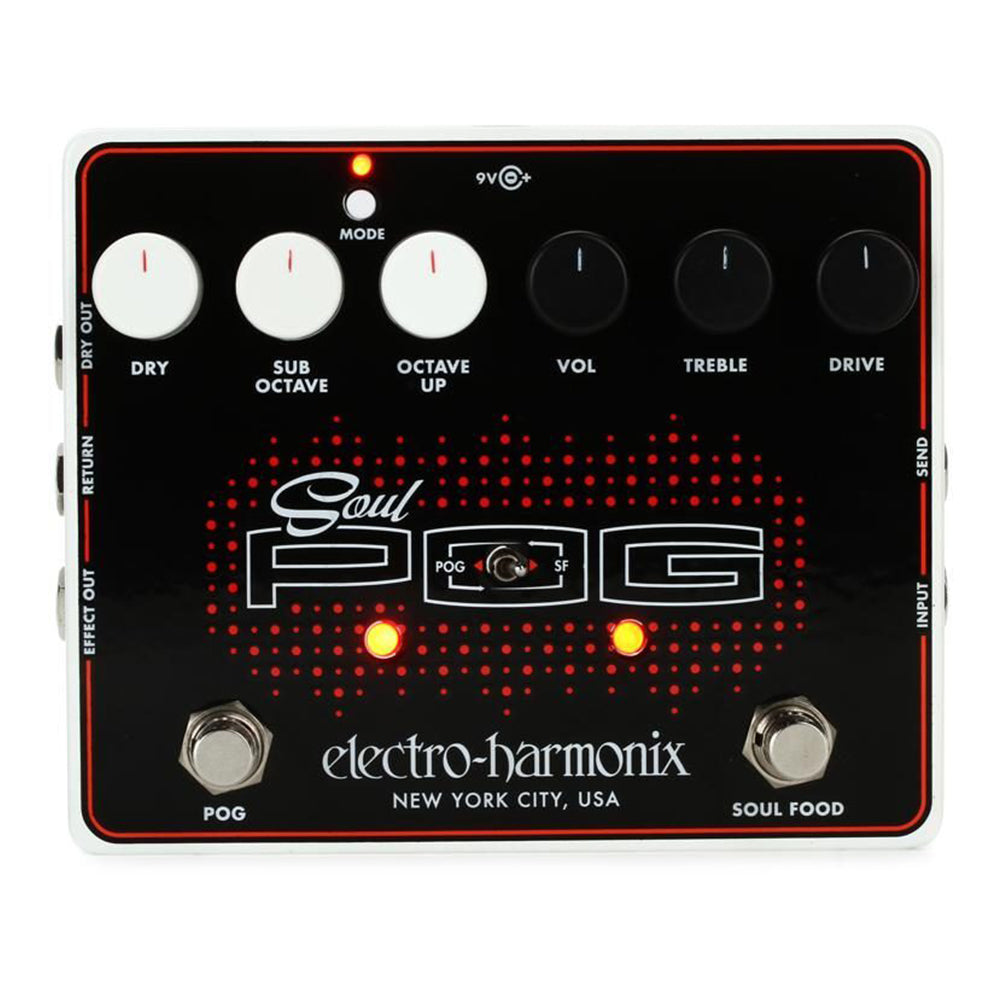 Combines two sweet pedals — the Soul Food transparent overdrive and Nano POG polyphonic octave generator—-in one potent multi-effect. Use them alone or together, put either first in the chain, insert other pedals between them with the FX loop. Also includes a cool Mode switch for a choice of two different octave-up sounds. The versatile EHX Soul POG delivers award-winning overdrive and flawless polyphonic octaves in any combination!