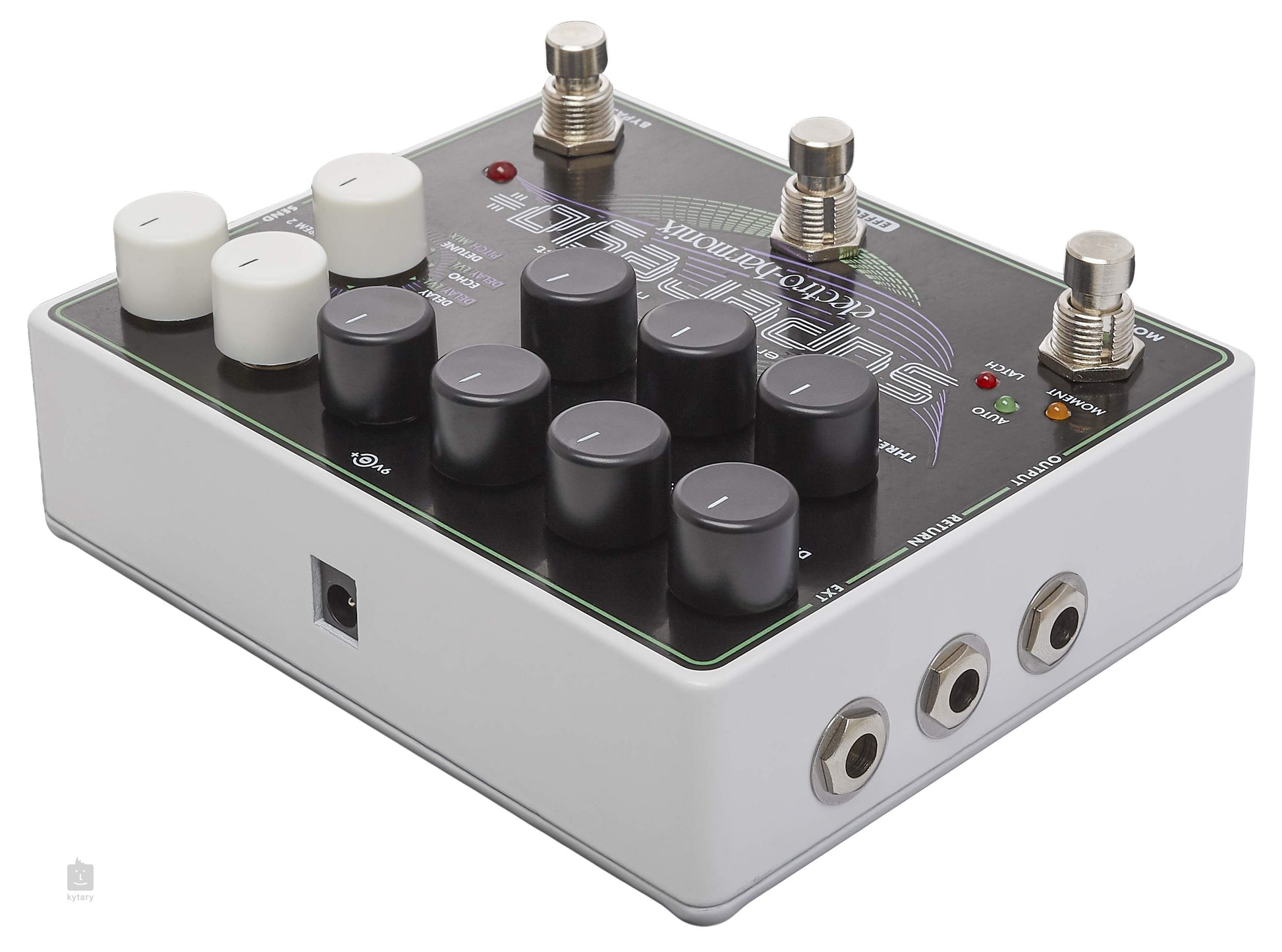 The polyphonic Superego+ works with guitar as well as other instruments including bass, keyboards, vocals, drums, etc. and comes equipped with an EHX 9.6DC-200 AC Adaptor.