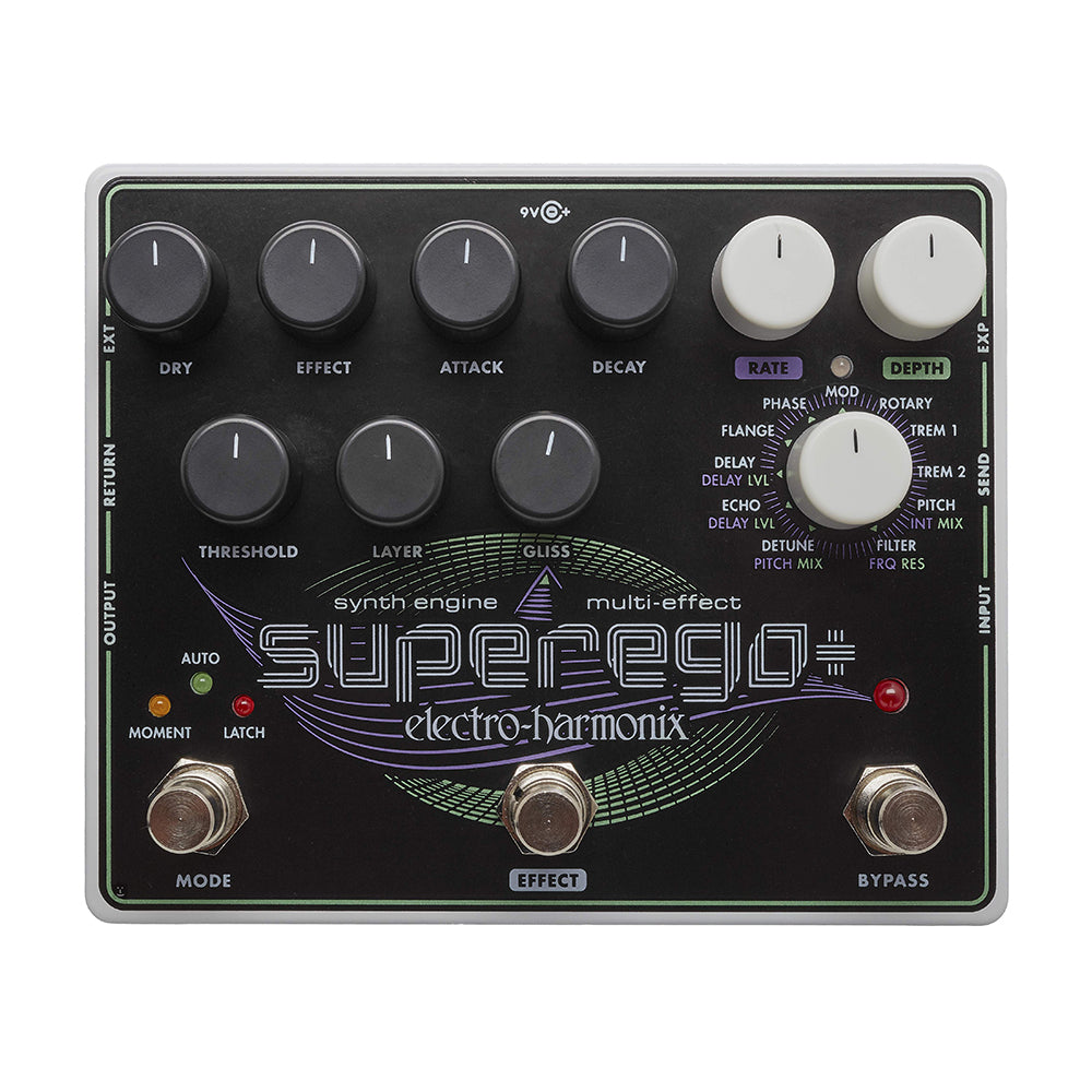 Building on the synthesis platform of the award-winning Superego, the EHX Superego+ Synth Engine raises the bar when it comes to creating synth effects, sound layers, glissandos, infinite sustain and more. Plus, we’ve added a complete effects section featuring 11 effects types, an EXP input for effect parameter control/preset recall and an EXT jack for a 3-button controller.