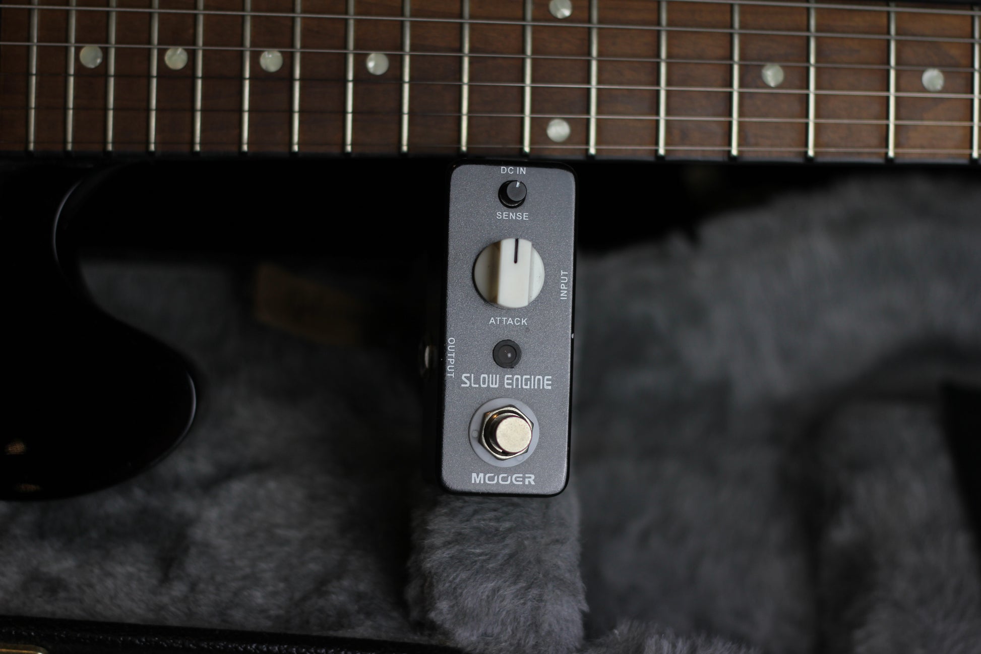 The Slow Engine cuts off the attack of each note and produces and effect like rolling up the volume knob on the guitar or that of a bowed instrument. The Slow Engine has two controls. With the Attack knob you can control the speed of the volume swells and with the Sense knob the amount of the effect. Used with delay can create some interesting backwards sounding passages.