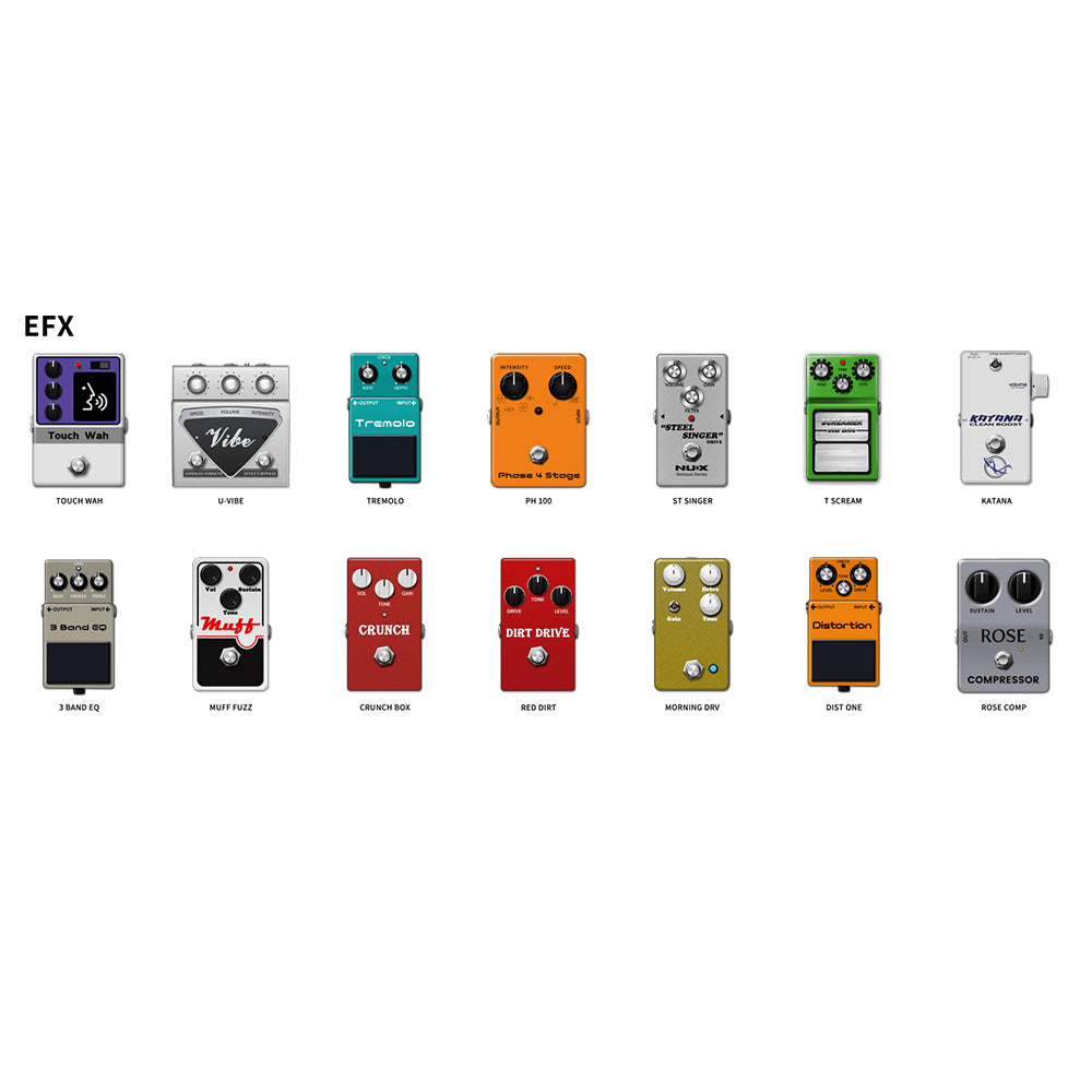 Touch Wah, U-Vibe, Tremolo, PH 100, ST Singer, T Screamer, Katana, 3 Band EQ, Muff Fuzz, Crunch Box, Red Dirt, Morning Drive, Dist One, Rose Comp