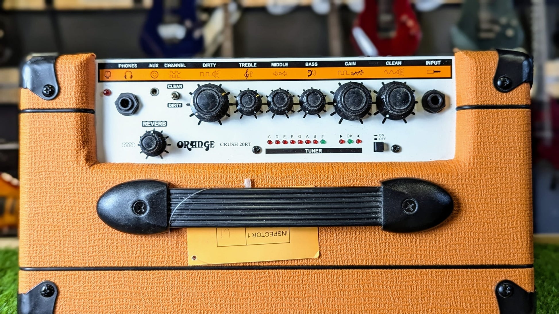 | Top Panel (Right to Left): | Instrument Input, Clean Volume, Dirty Gain, Bass, Middle, Treble, Dirty Volume, Channel Selector Switch, Aux In, Headphone Output (BELOW): Integrated Chromatic Tuner, Reverb |